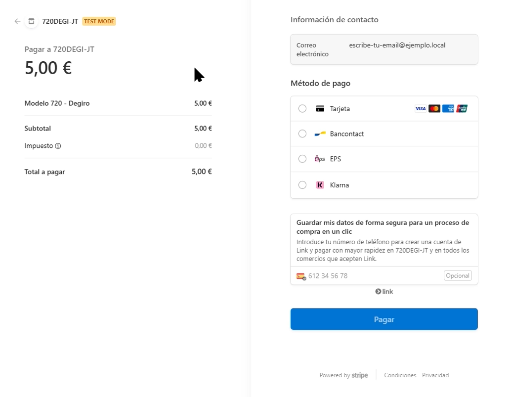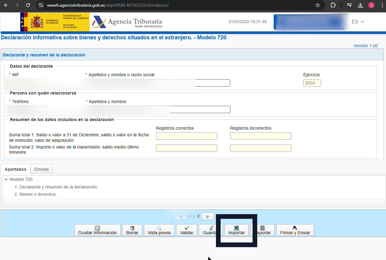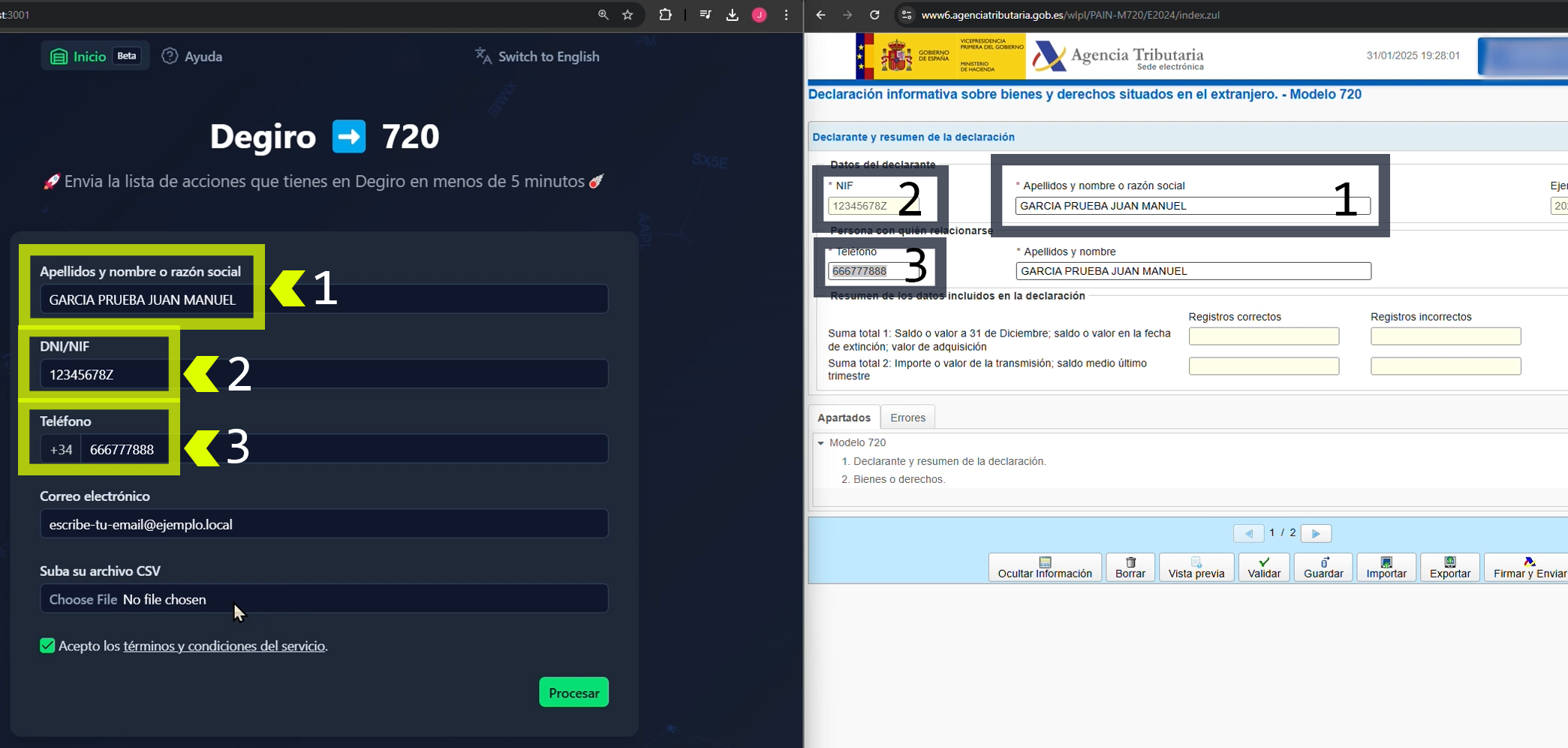 Enviar emailPara generar el archivo 720, es necesario añadir los mismo datos para que sea correcto, si no confías en esta web, puedes utilizar el botón de utilizar datos de prueba, lo que podría provocar que puedan aparecer errores en la web de la agencia tributaria. En las pruebas que hemos realizado, el sistema es válido sin indicar nombre completo, nif y número de teléfono correctos, ta que la importar parece que solo utiliza la lista de acciones