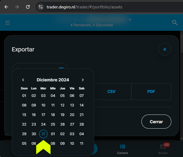 Inicia sesión en Degiro, ve a la sección 'Cartera' y haz clic en el botón de exportar. Selecciona el 31 de diciembre del año anterior y el formato CSV.